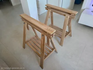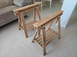 Par de borriquetas o caballetes de IKEA, ideales para mesa de escritorio o como soporte. - Altura regulable para adaptarse a diferentes necesidades. - Construcción robusta y estable. - Fácil desmontaje. Tiene marcas de roces de la silla de ordenador normales del uso.