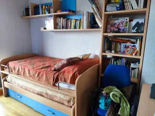 Se vende habitación juvenil completa, ideal para optimizar el espacio. - Cama nido con cajones inferiores. - Estanterías de pared. - Mueble de almacenaje con baldas. - Escritorio. - Silla de escritorio.