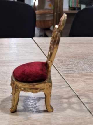 Medidas 11x5 Preciosa mini silla de coleccionista. Ideal para decorar un escritorio o una estantería. - Es debronce con un cojín de terciopelo rojo. - Tiene un diseño antiguo y elegante. - Se encuentra en buen estado.