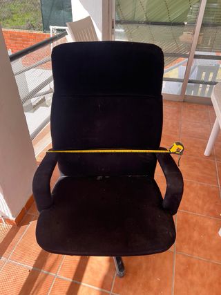 Silla de oficina giratoria, color negro. Está en buen estado, ideal para trabajar desde casa u oficina. tiene un arañazo en lanparte trasera del roce - Mecanismo de ajuste. - Base de 5 ruedas. - Asiento y respaldo de tela.
