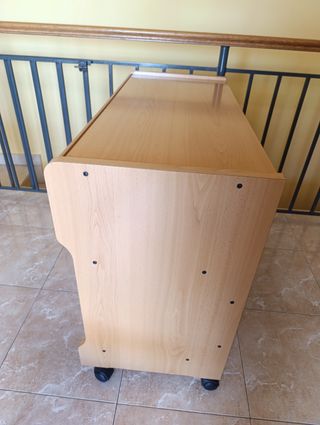 Mesa para escritorio y/u ordenador con 3 cajones, bandeja para teclado y ruedas para facilitar su movimiento. Además tiene hueco para meter la silla. Medidas: 100x45x78 cm. Tiene alguna picadura según las 3 últimas fotos.