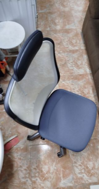 - Una silla de oficina con asiento y respaldo tapizados en tela azul antimanchas. -Una silla polipiel negra con respaldo alto - Base de plástico con ruedas. - Reposabrazos de plástico negro. - Funcionamiento perfecto de ruedas y regulador de altura. - Sólo venta en persona.