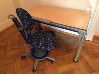 Mesa y silla de estudio Moll Runner Compact Comfort, en buen estado. Ideales para niños, adolescentes y adultos. - Altura regulable. - Diseño moderno y funcional, incluye extensión. - Incluye silla con ruedas.