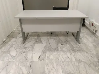 Conjunto de escritorio y silla para oficina o estudio. El escritorio tiene un diseño moderno y funcional. - Escritorio con estructura metálica y tablero blanco. - Silla a juego con detalles en gris.