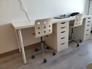 Mesa de escritorio con un diseño moderno y funcional, perfecta para tu espacio de trabajo. - Superficie de madera clara. - Base de metal resistente. -3 sillas -Armario (se vende todo el conjunto, no se vende nada suelto)