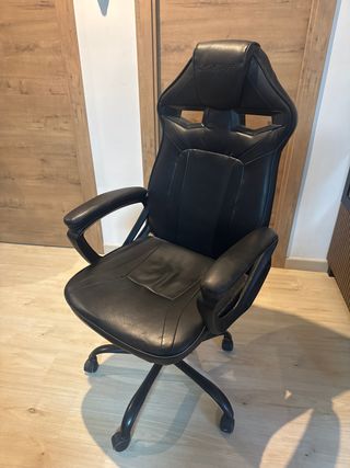 Silla de escritorio estilo gamer en color negro. - Diseño ergonómico. - Tapicería de cuero sintético. - Base con ruedas para fácil movilidad.