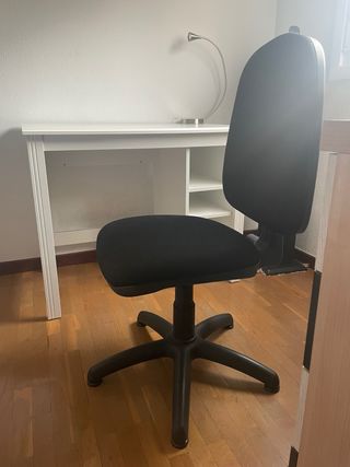Silla de escritorio negra con respaldo y 5 ruedas. Es cómoda y funcional. Para escritorio de niño de 5 a 12 años diría yo dependiendo la altura del niño. Se puede regular un poco en altura el respaldo. En perfecto estado. El asiento y el respaldo son acolchados y cómodos
