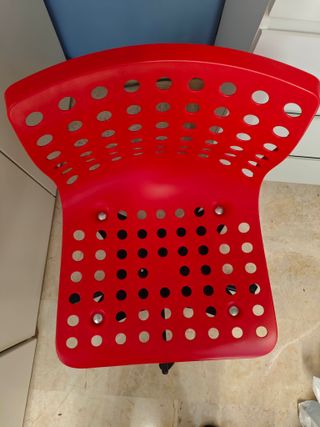 Se vende silla de escritorio de color rojo. Es giratoria y tiene ruedas. - Estructura de plástico resistente. - Asiento y respaldo acolchados. - Ideal para oficina o estudio. Se sube y baja Le cuesta un poquito rodar.