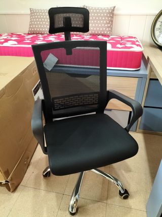 Silla de escritorio con diseño ergonómico y reposacabezas. Silla de oficina con ruedas y reposacabezas en polipropileno - Respaldo de malla transpirable. - Asiento acolchado. - Base con ruedas para fácil movilidad. Tiene una pequeña rotura en la malla del respaldo, no se ve demasiado y no afecta a su funcionalidad Tiene una percha en el respaldo que es super practica para colgar la chaqueta