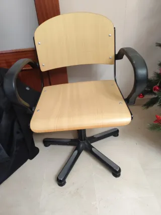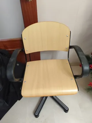 Silla de escritorio en buen estado, con asiento y respaldo de madera y estructura metálica. - Base giratoria con ruedas. - Brazos ergonómicos.