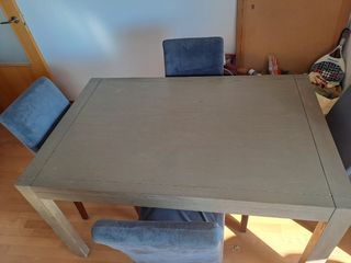 Conjunto de escritorio y silla de estudio. - Escritorio con superficie de madera. - Silla con base de plástico y asiento/respaldo de tela. - Medidas del escritorio: Alto: 80 cm, Ancho: 1,15 m, Profundo: 50 cm. Se recoge en Nervión.