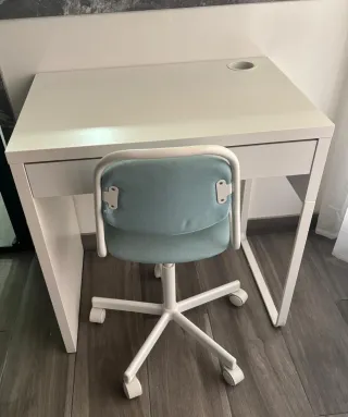 Escritorio blanco de IKEA con un diseño moderno y funcional, ideal para espacios infantiles o juveniles. Cuenta con un práctico orificio para la gestión de cables y un cajón. Se vende junto a la silla con ruedas.