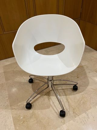 Preciosa silla de escritorio giratoria, de diseño moderno y elegante. Es perfecta para cualquier espacio de trabajo. - Estructura cromada resistente. - Asiento cómodo y ergonómico. - Ruedas para facilitar el movimiento. Tiene signos de desgaste en los bordes frontales de los reposabrazos. Las medidas de altura 86cm es el máximo, se puede graduar y el fondo de la silla son 47, el de las ruedas 60cm.