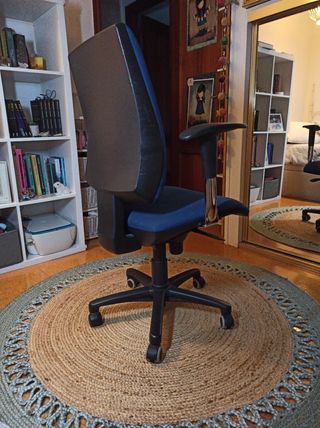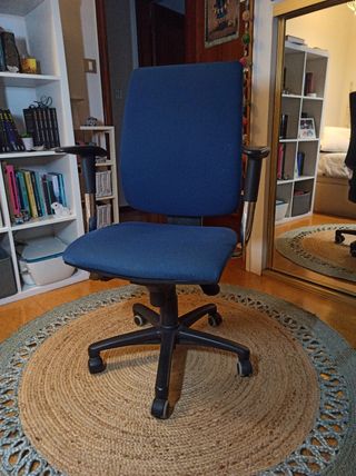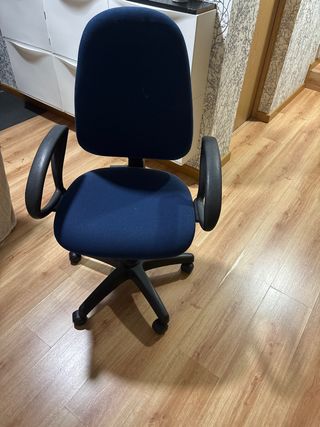 Cómoda silla de escritorio de color azul marino. Se encuentra en buen estado. - Giratoria. - Con ruedas. - Brazos incluidos. Sólo entrega en mano