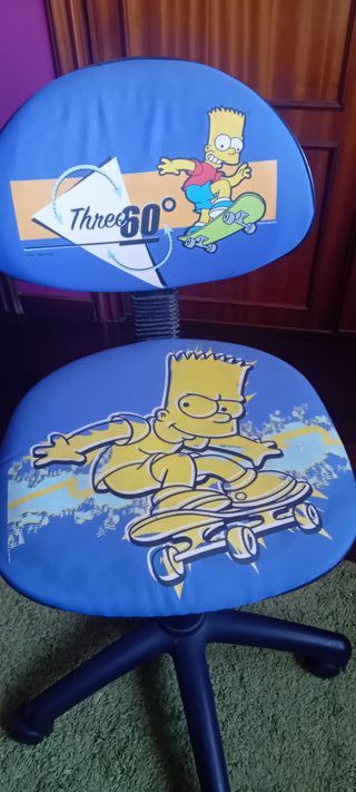 Silla de escritorio con diseño de Bart Simpson. - Ilustración de Bart Simpson con patineta. - Gráfico Three60 con detalles de flechas. - Base de plástico con ruedas.