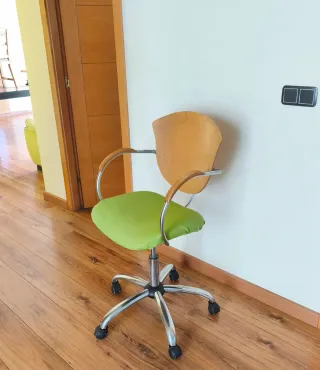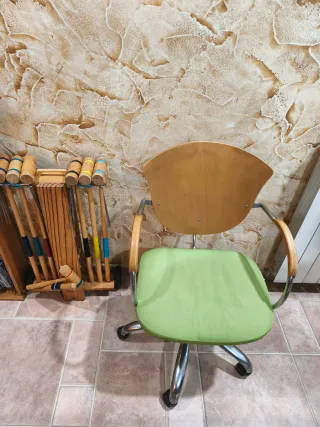 Silla giratoria con ruedas SÚPER CÓMODA. Se puede regular la altura del sillón (45-60cm sobre el suelo). Sirve tanto para silla de escritorio como para silla profesional de peluquería. La parte donde te sientas es acolchada y se le ha comprado un forro verde nuevo recientemente. El respaldo es de madera y tiene la forma perfecta de la espalda. Además es amplio y rígido, de modo que sujeta muy bien toda la espalda y permite que la tengas completamente derecha. Personalmente a mí encanta y me parece súper cómoda. Tengo otra igual como silla de escritorio que uso a diario. Al ser la estructura de madera y metal, es muy resistente.