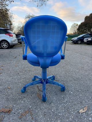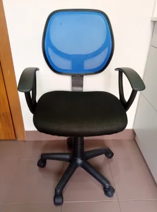 Silla de oficina con un diseño moderno y cómodo. Características Principales Tipo: Silla de escritorio/oficina giratoria. Material: Tapizado en tela de color azul tanto el asiento como el respaldo (ha perdido color) Base: Cuenta con una base de plástico con cinco ruedas para facilitar la movilidad. Venta en persona