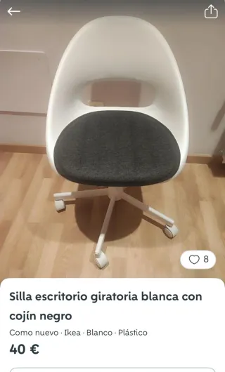 Preciosa silla de escritorio, perfecta para cualquier espacio de estudio. Es giratoria y tiene un diseño moderno. - Estructura de plástico resistente. - Base giratoria de metal blanco. - Ideal para estudiantes Se venden juntas o por separado. 40€/unidad