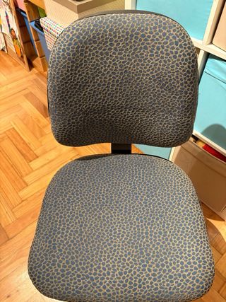 Silla de oficina bastante viejita pero funcional. Me da pena tirarla porque es es cómoda t la arreglamos para que estuviera estable. El asiento gira, sube y baja pero las ruedan van un poco mal. Si se tapiza puede quedar pobriña y tener una segunda vida.