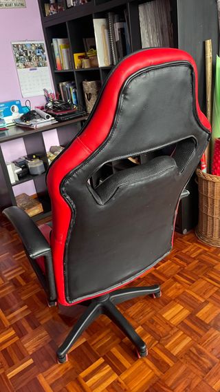 Silla de escritorio giratoria, ideal para niños. Es de color rojo y negro, y está en buen estado. - Perfecta para una habitación infantil o juvenil. - Diseño cómodo y ligero. - Fácil de mover gracias a sus ruedas.