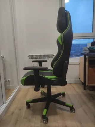 Silla de escritorio con diseño deportivo en color negro y verde. - Respaldo alto con soporte lumbar. - Reposabrazos acolchados. - Base con ruedas para fácil movilidad.