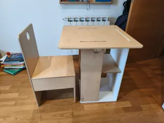 Conjunto de mesa y silla de escritorio para preescolares, con un diseño moderno en blanco y madera. - Mesa con compartimentos de almacenamiento. - Silla con respaldo y asiento blancos. - Patas y estructura de madera natural. DIMENSIONES MESA: An. 70,7 x al. 53 x Prof. 51,2 cm Altura de la superficie de trabajo: 60 cm. DIMENSIONES Silla : Altura total: 55 cm. Asiento: altura 30 cm, ancho 30 cm, profundidad 37,5 cm. De paneles de MDF E1 con acabado lacado NC. Patas de contrachapado. La Silla se ha usado muy poco y está en perfecto estado. La mesa de escritorio se ha tenido en la caja original sin usar y se montado para la venta.
