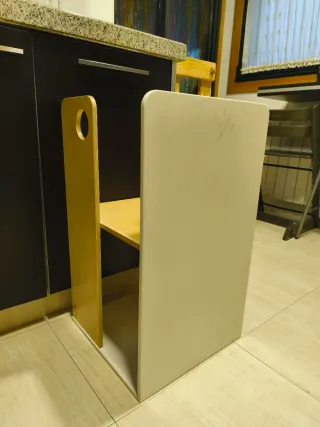 Mueble infantil multifuncional que sirve como trona, torre de aprendizaje y escritorio con silla para niño de 7-8 años, o 2 sillas pequeñas con sus escritorios para niños más pequeños de 7-8 años.Fabricado en madera y blanco. - Diseño 4 en 1. - Bandeja superior. - Cajón con hueco. - Estante inferior.