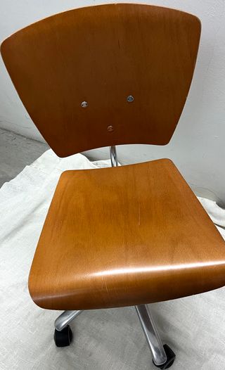 Silla de escritorio con un diseño moderno y funcional. - Asiento y respaldo curvos de madera. - Base y ruedas de metal.