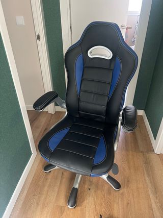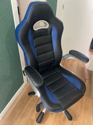 Silla de escritorio con diseño ergonómico, ideal para sesiones de juego o trabajo. Usada pero bien conservada, solo uno de los reposabrazos claramente desgastado. - Tapicería en cuero sintético negro con detalles en azul. - Reposabrazos acolchados. - Base metálica con ruedas.