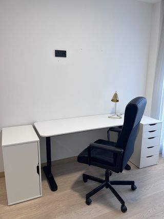 Escritorio BEKANT blanco con patas negras y red cubre cables (foto), cajonera IKEA ALEX de 5 cajones, módulo auxiliar ALEX con puerta y estante, silla de oficina MILLBERGET y lámpara Zara Home (incluye bombilla). Todo en buen estado, funcional y muy cuidado. La silla presenta desgaste estético en el asiento por uso (se soluciona con una funda), pero funciona perfectamente y es muy cómoda. Se vende el conjunto completo. Necesario al menos 2 personas para la recogida. Medidas del escritorio: 140 ancho x 60 fondo mesa x 74 alto. Recogida en domicilio, 📍Vigo (zona Arenal/Rosalía). Precio algo negociable si se recoge rápido.