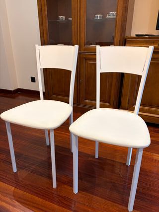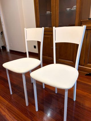 Conjunto de dos sillas modernas de color blanco. Perfectas para cualquier espacio. Estructura resistente con patas rectas y asiento acolchado tapizado en blanco, fáciles de combinar con cualquier mesa de comedor, cocina o escritorio. Son ligeras pero estables, ideales para comedor, cocina o zona de trabajo.