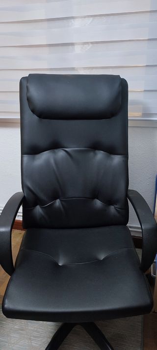 Se vende silla de escritorio. Es de color negro y está fabricada con piel sintética. Tiene un diseño elegante y se encuentra en buen estado. - Giratoria - Con ruedas - Respaldo alto - Reposabrazos