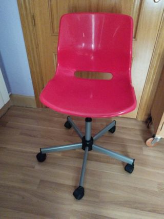 Silla de escritorio juvenil de Ikea, ideal para estudiar. Es de color rojo y está en buen estado. - Estructura giratoria con ruedas. - Asiento de plástico resistente. - Perfecta para habitaciones juveniles.