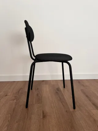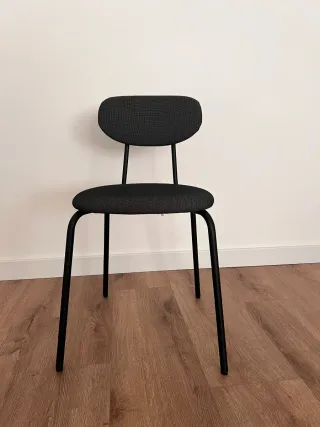 Silla de escritorio con patas metálicas negras, y asiento y respaldo tapizados en tela.