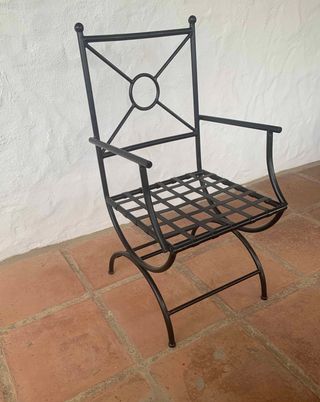 Preciosa silla de jardín de metal,de forja cordobesa, ideal para darle un toque rústico a tu espacio exterior. Sillas realizadas por herrero..Ideales para jardín..agarran muy bien en césped o tierra debido a su peso ..sobre unos 10 kgs.. Tengo 6 unidades - Estructura resistente y elegante. - Diseño con respaldo curvado y detalles en la parte superior. - Perfecta para uso en exteriores. Siempre han estado en porche cubierto,no han sufrido las inclemencias del tiempo. El precio es por unidad.