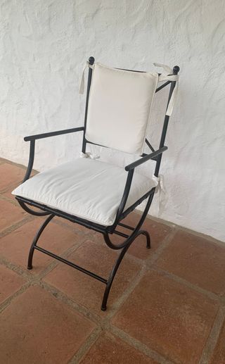 4 Sillas de hierro forjado, sólida, con cojines blancos, en perfecto estado. Cada silla vale 50€ con los cojines incluidos. Se venden juntas o bien por separado. Las sillas están en Marbella.