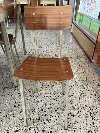 Conjunto de sillas escolares con un diseño clásico y funcional. - Asiento y respaldo de madera - Estructura de metal Disponemos de más de 100 sillas Precio por unidad
