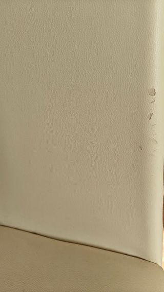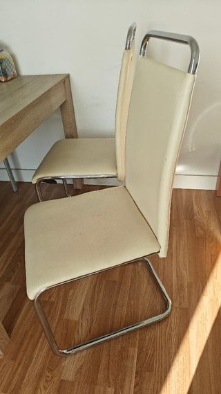 Conjunto de sillas de comedor con un diseño moderno y elegante. - Estructura de metal cromado. - Asiento y respaldo tapizados en polipiel beige/blanco piedra. - Hay desperfectos de la polipiel en ambas sillas. - Una de las sillas está rota (el hierro de la parte de arriba) pero no impide su uso.