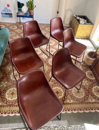 Conjunto de cuatro sillas(100€/u) de piel estilo butaca de la marca SOL Y LUNA.( diseñador Alberto Vilca) - Diseño moderno y elegante. - Patas de hierro finas y resistentes. - Asiento en piel ergonómico y confortable. -Las butacas estuvieron durante 2 años en un restaurante diseñado por LAZARO ROSA VIOLAN. Su precio a día de hoy valorado por el distribuidor SOL Y LUNA es de 965/u.