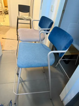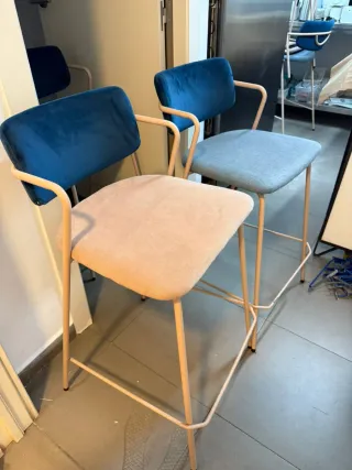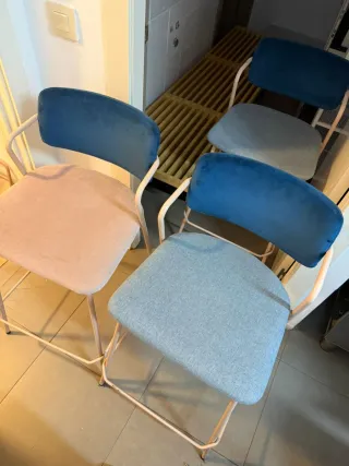 Conjunto de sillas altas con un diseño moderno y elegante. Disponible 8 unidades. Menos de 1 año de uso. - Tapicería de terciopelo. - Estructura hierro. - Combinación de colores azul y rosa.