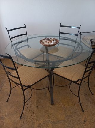 Mesa de comedor única y artesanal. Está hecha con una artesa restaurada de más de 100 años procedente de un cortijo. Las estructura se hizo a medida con hierro forjado, así como el cristal. MEDIDAS: *Tablero de cristal * - 237 cm largo x 110 cm ancho *Artesa (cuerpo de madera)* - 227 cm largo x 90 cm ancho *Alto total* - 76 cm desde el suelo, cristal incluido. Regalamos también 6 sillas con la compra de la mesa. LA RECOGIDA Y TRANSPORTE CORRE A CARGO DEL COMPRADOR, NO SE HACEN ENVIOS. - Tablero de cristal transparente. - Base de metal forjado con detalles ornamentales. - Estructura de madera robusta (artesa).