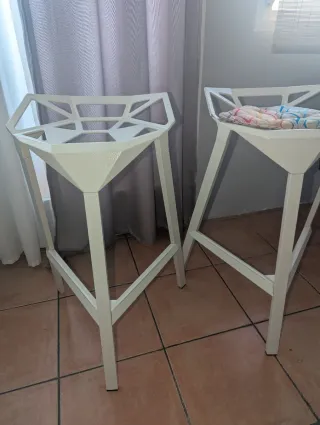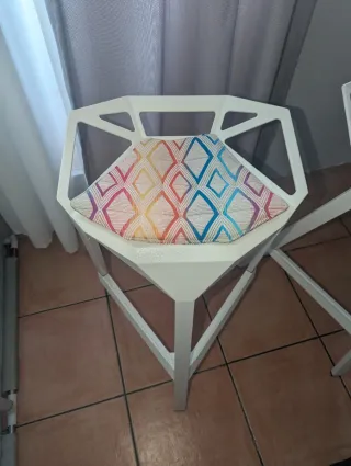 Taburetes de diseño moderno. 1- 60€ 2- 100€ - Estructura de hierro. - Acabado en color blanco. - Asiento con diseño geométrico.