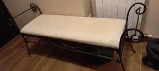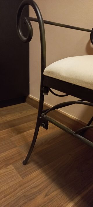 Banco de hierro con un diseño elegante y un cómodo asiento de tela. Aporta un toque de estilo a cualquier espacio. - Estructura metálica robusta. - Asiento acolchado en tela.