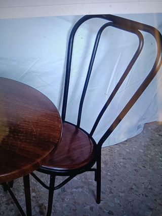 Sillas de forja negras con tablero werzalit color nogal. Tienen algunas picadas en las patas por haber sido apiladas, pero con pintura en spray se soluciona. Aproximadamente 44 unidades. Medidas: 42cm hasta el hierro del asiento, 89cm hasta el respaldo, 42cm diametro y el asiento sube 1.5 cm.
