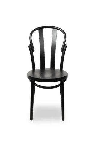 Elegante silla de madera con un diseño clásico y curvo. Su acabado oscuro le da un toque sofisticado. - Respaldo con varillas. - Brazos curvos. - Asiento cómodo.