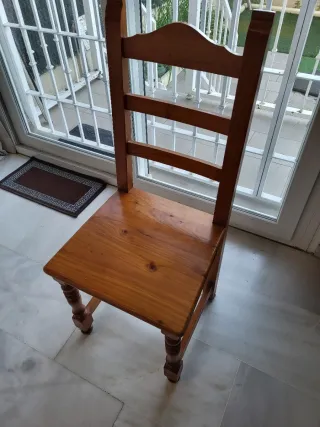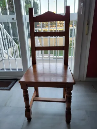 Silla de madera de pino con un diseño clásico y robusto. - Patas torneadas. - Respaldo con travesaños. No ha tenido uso. Está como nueva. No se hacen envíos.
