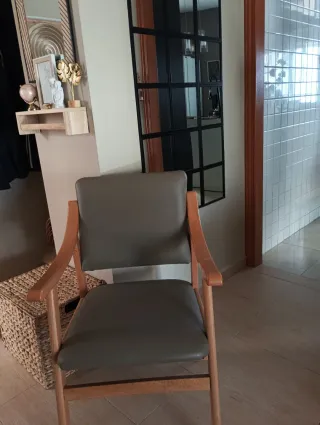 Silla con estructura de madera y asiento de polipiel en color topo. - Diseño moderno y elegante. - Patas de madera resistentes. - Asiento y respaldo cómodos.