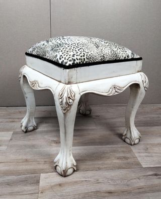 Taburete antiguo, de madera tallada, recién lacado en blanco decapé, con tapicería nueva de diferentes huellas de felino. La tela tiene un tacto suave y aterciopelado. Más productos en mi perfil.