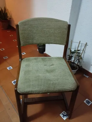 Conjunto de sillas antiguas con un diseño clásico. - Estructura de madera resistente y en perfecto estado. - Tapicería de tela en tono beige y marrón para restaurar. - 6 Unidades. - 10€ por Unidad.
