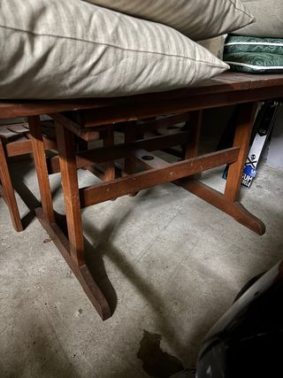 Mesa de exterior de madera. Necesita capa de barniz para dejarla perfecta otra vez. Posibilidad de vender sillas. 35 cada unidad.
